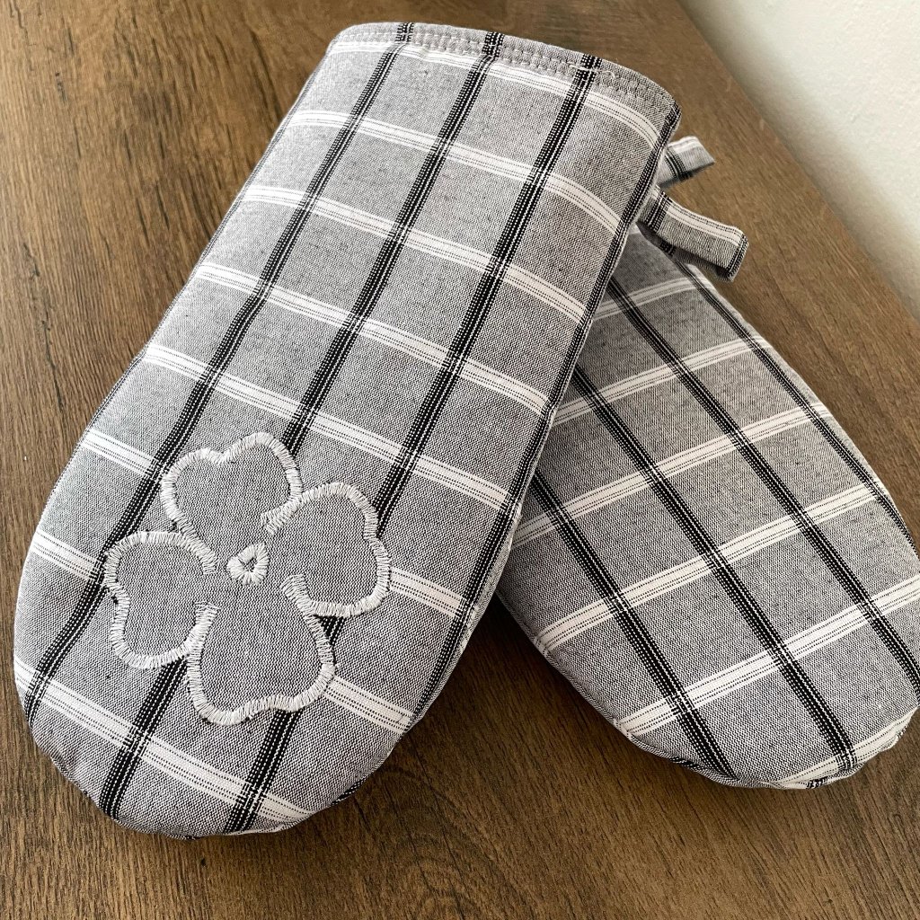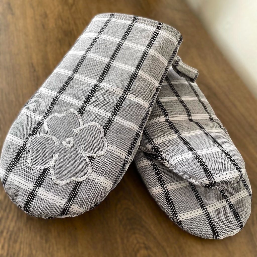 Na jedné chňapce je vyšitý čtyřlístek pro štěstí – ta je pro Ni. Druhá je bez ozdoby – ta je pro Něho. Tento pár se tak hodí nejen pro každodenní vaření, ale i jako milý a praktický dárek.