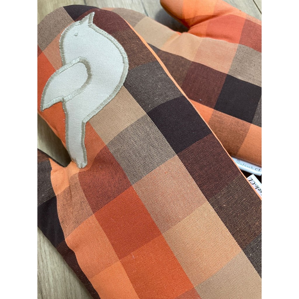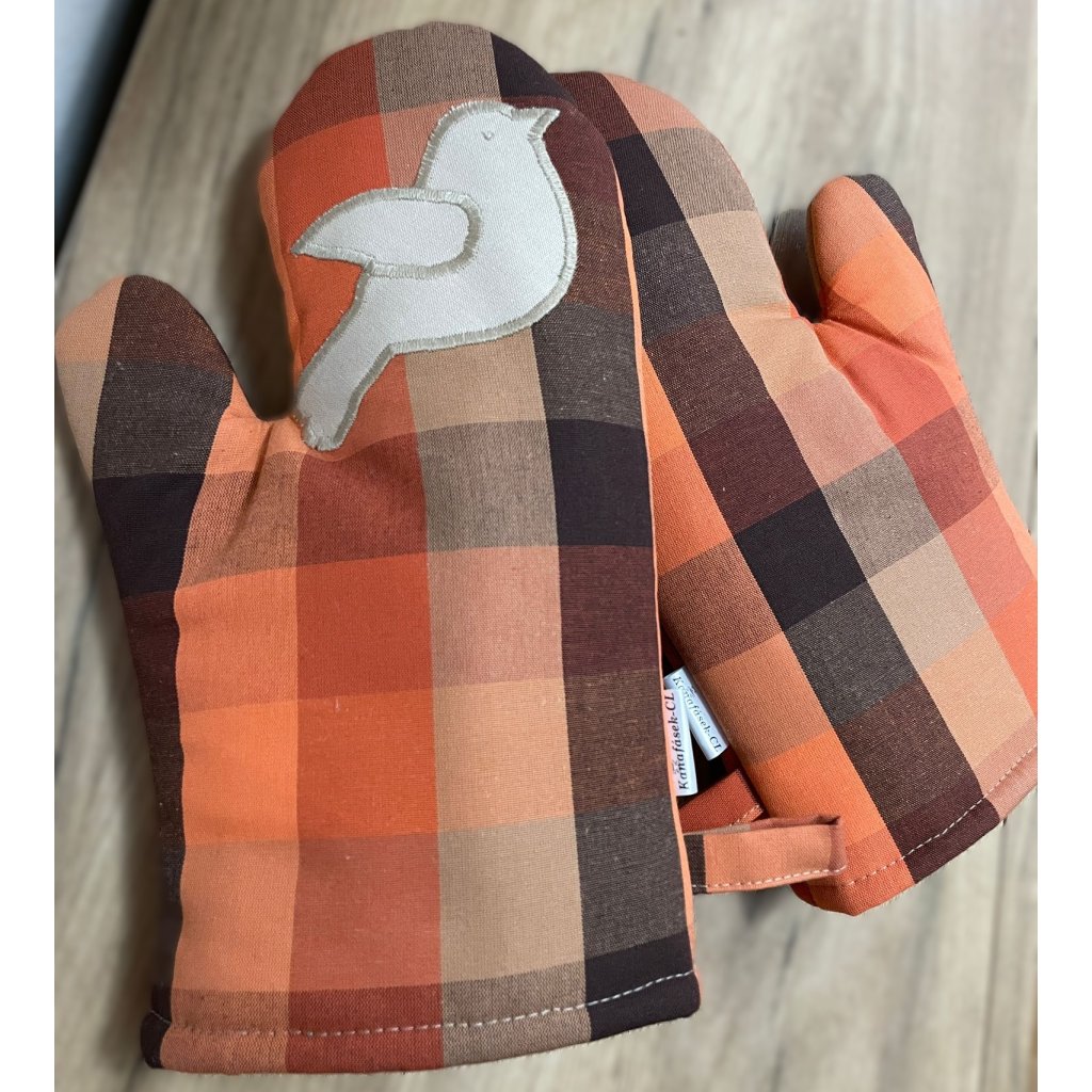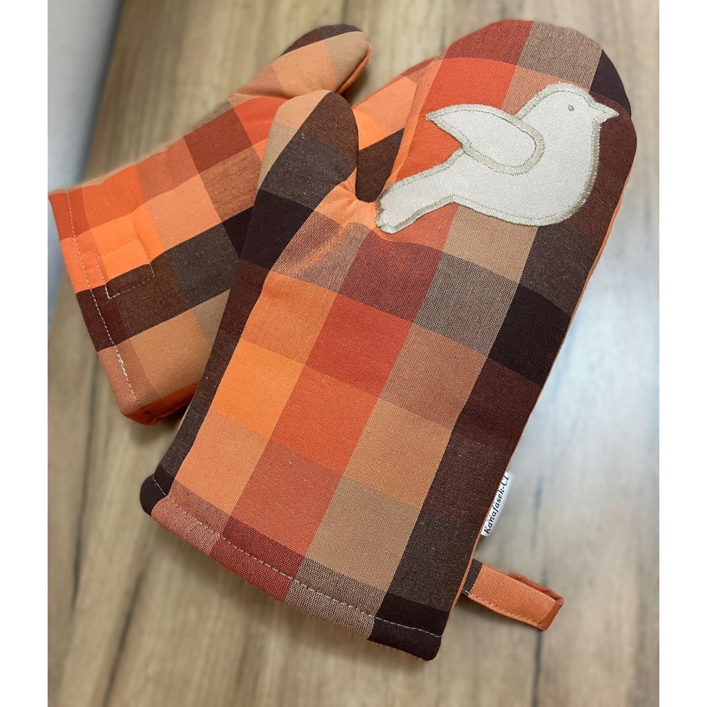 Kuchyňské chňapky 1 pár - kostkovaný vzor, odstíny oranžové a hnědé, s aplikací ptáčka