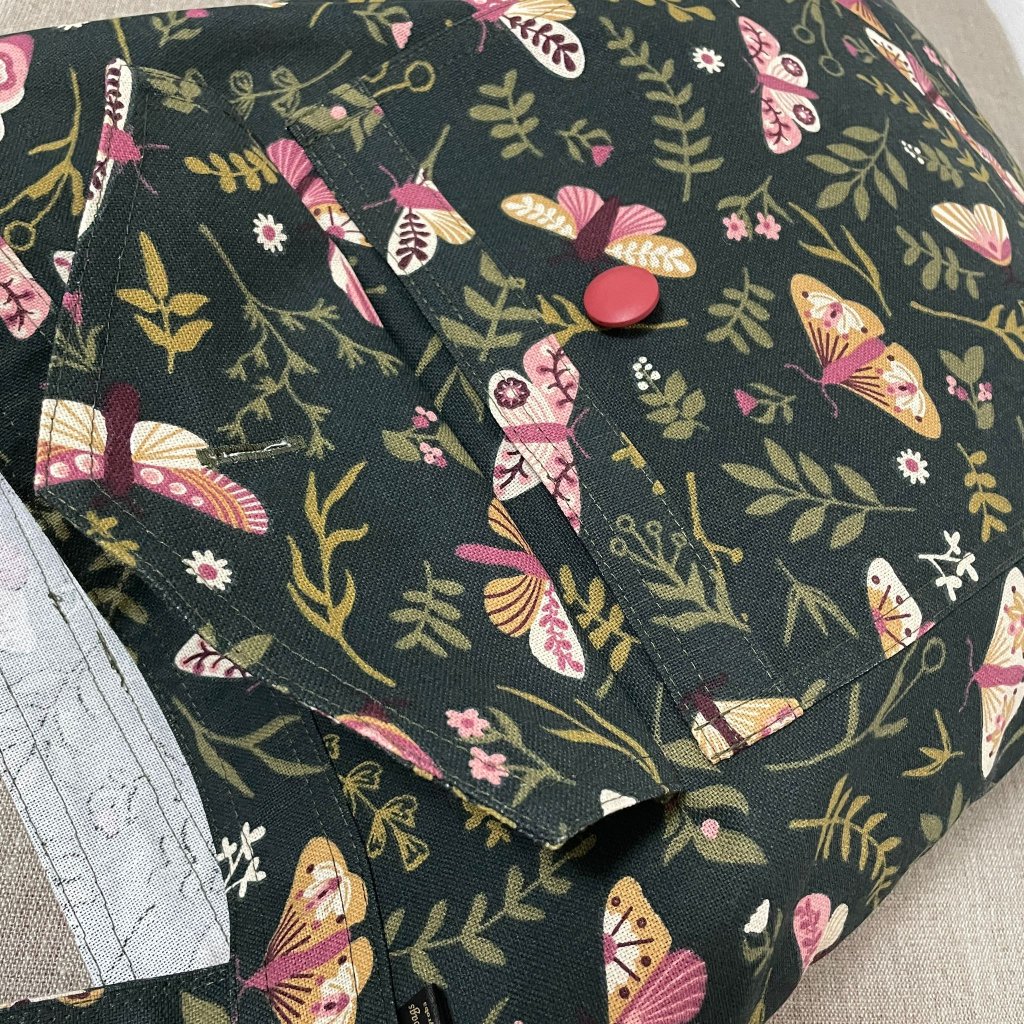 Má přední kapsu na zapínání s knoflíkem a nosí se přes rameno.