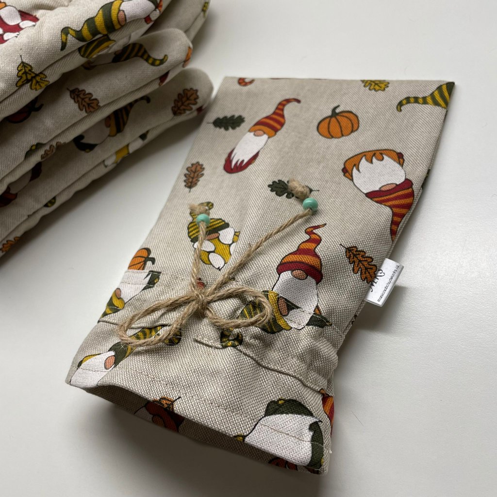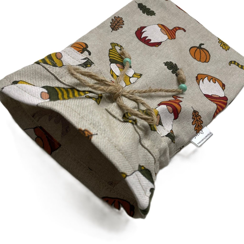 Není určen pro přímý kontakt s potravinami – režná dekorační látka nemá atest pro potravinářské použití. Pokud jej používáte na pečivo či jiné potraviny, doporučujeme vložit papírový sáček nebo utěrku.