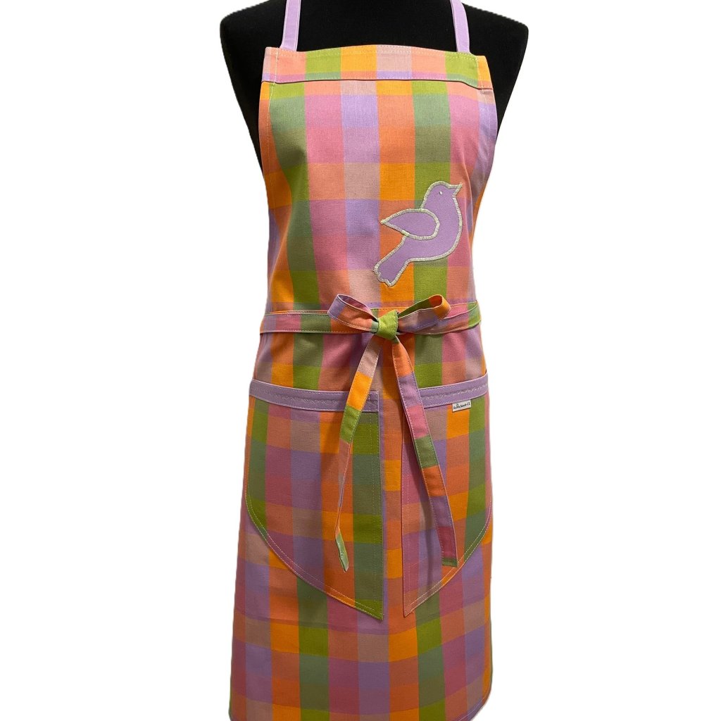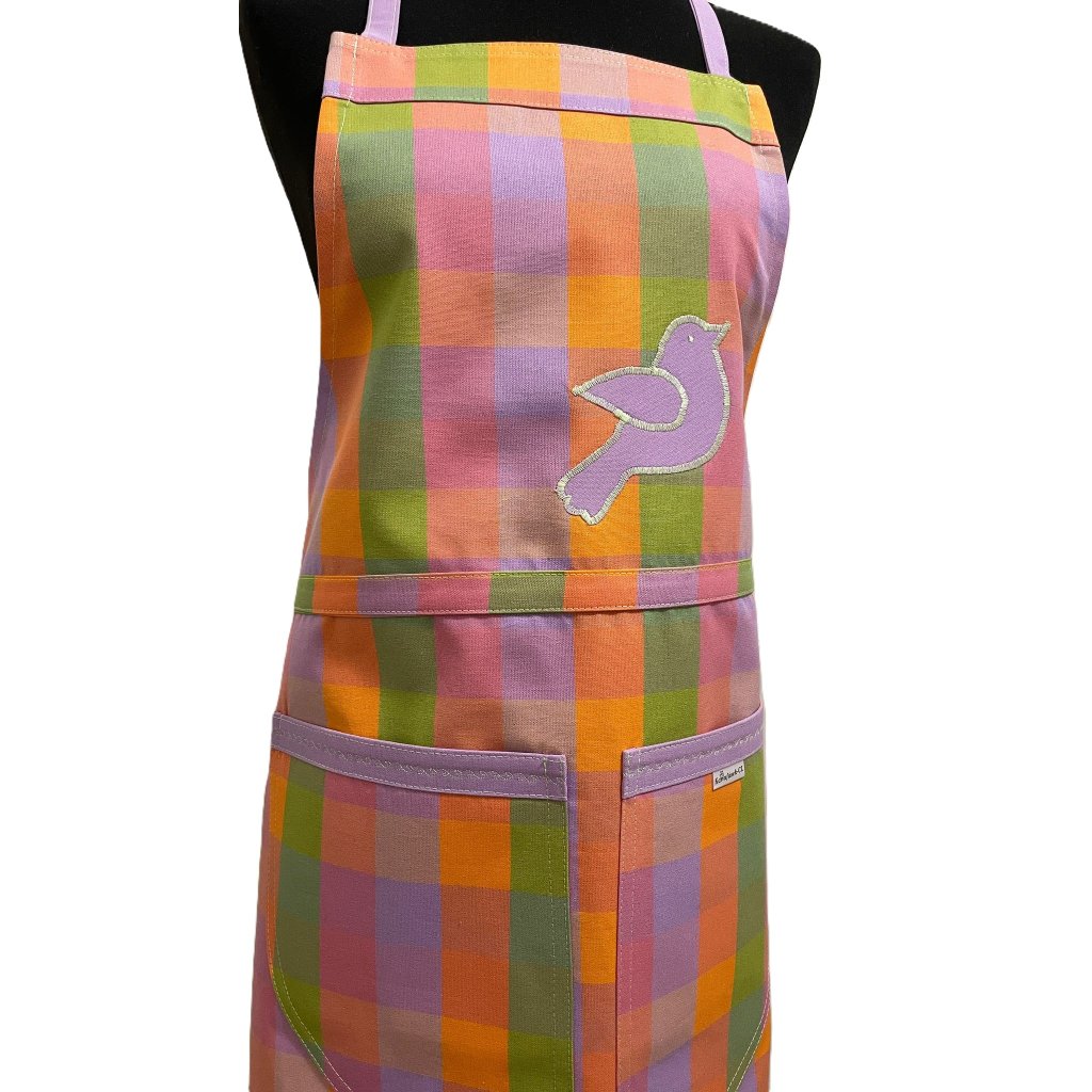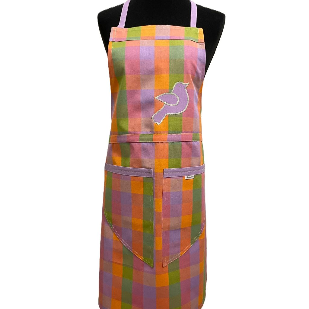 Zástěra z kanafasu - barevné kostky, nášivka ptáčka