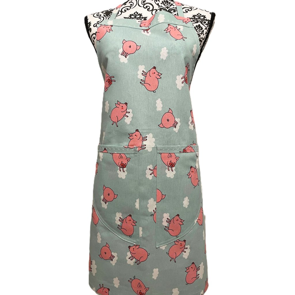 Zástěra z režné látky, modrá - růžové prasátko